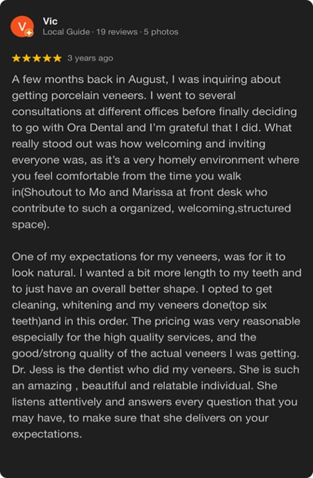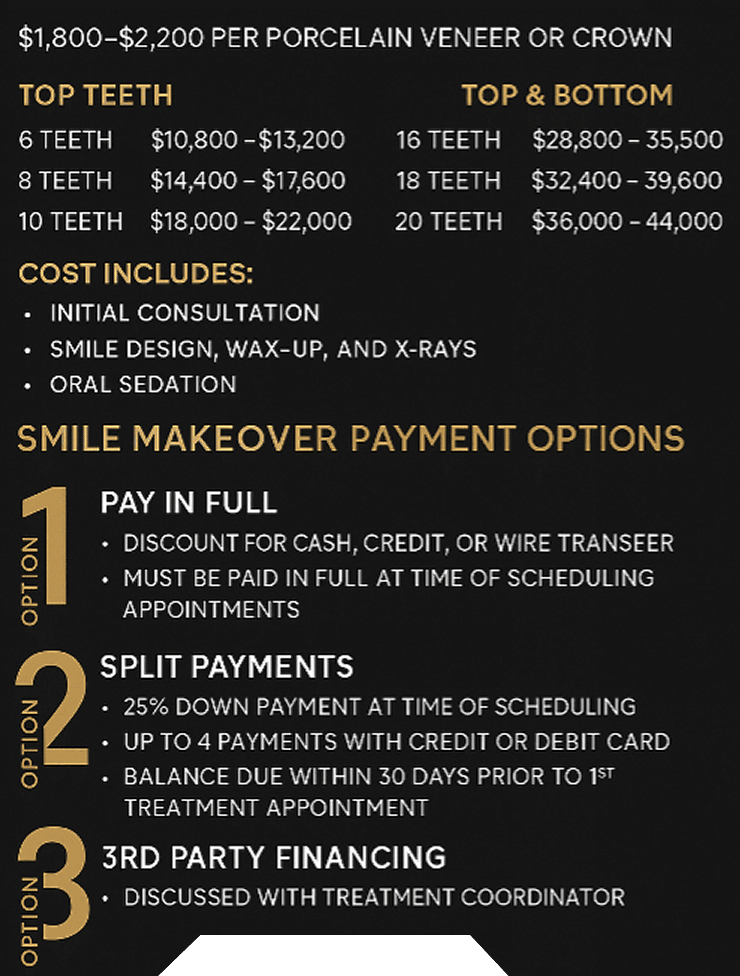 Veneer pricing can vary based on the dentist’s experience, location, and the quality of materials used. Typically, veneers range from $1000 to $3000+ per tooth. Most smile makeovers involve 8–10 veneers on the upper teeth, making total costs range between $8,000 and $24,000 or more.